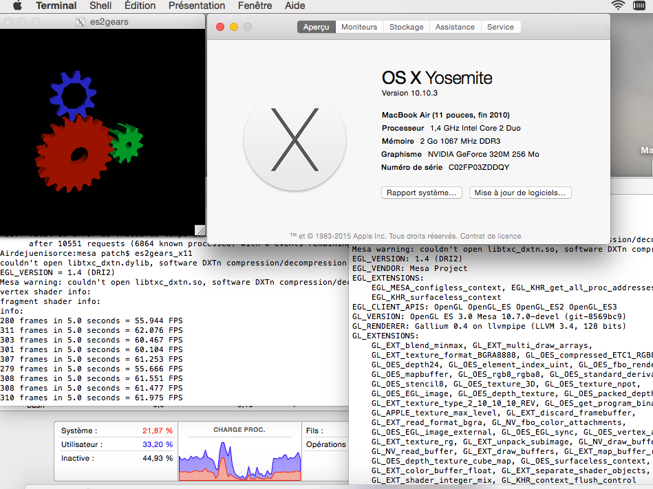 Created attachment 116583 [details] es2gears_x11 and es2_info with llvmpipe on osx Running gears with egl/gles2/x11 with llvmpipe software driver on osx.