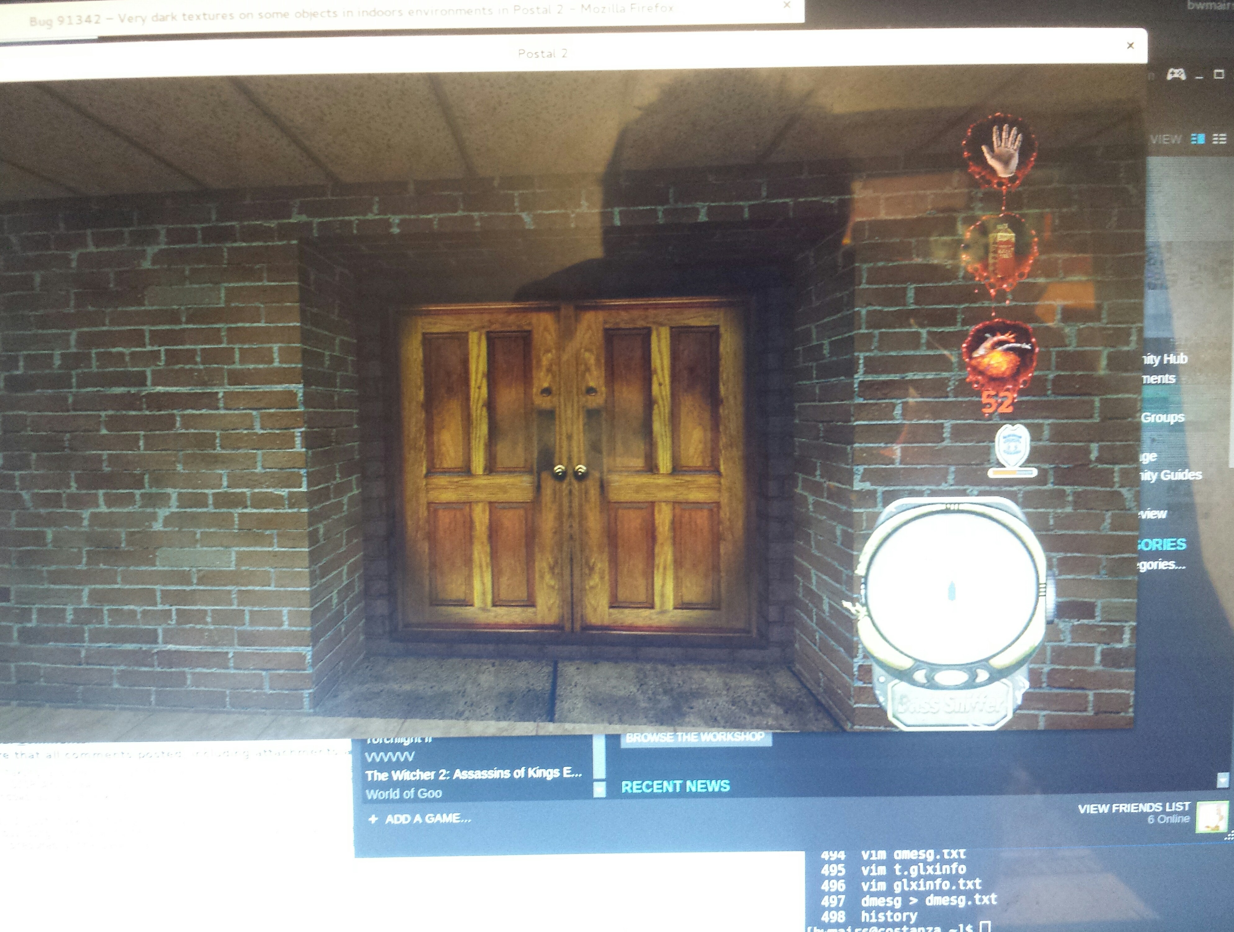 I'd like to take a screenshot, but Postal 2 likes to take over my desktop and I'm not certain how to rectify this. I can't alt-tab out of Postal 2 to take a screenshot and using Steam's screenshot utility, I only get garbled output. but on radeonsi on Cape Verde hardware (git-8787141) some models (mostly NPCs and doors) have VERY dark lighting, almost black. For the doors it is always the entire door that is dark, but it then sometimes is properly lit when I walk close enough to the door. For NPCs, they are sometimes properly lit below the waist and very dark above. I have an extra game in my Steam inventory and will be happy to send it to someone to help debug this.