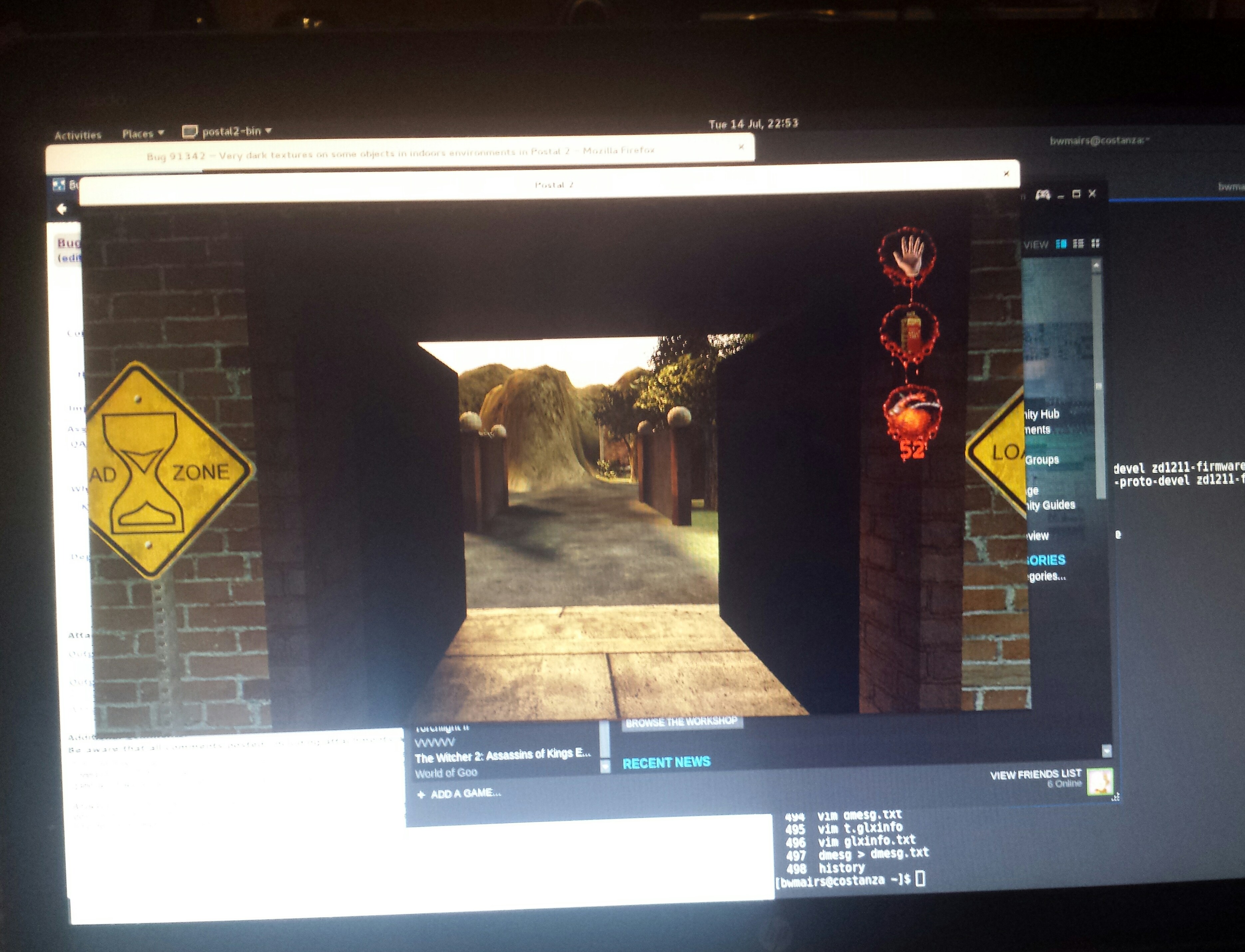 (In reply to acutiator from comment #0) > I'd like to take a screenshot, but Postal 2 likes to take over my desktop > and I'm not certain how to rectify this. I can't alt-tab out of Postal 2 to > take a screenshot and using Steam's screenshot utility, I only get garbled > output. You could log in via ssh and get a screenshot using a command line utility, or you could take a picture of the screen. Please attach the /var/log/Xorg.0.log file and the output of dmesg and glxinfo.