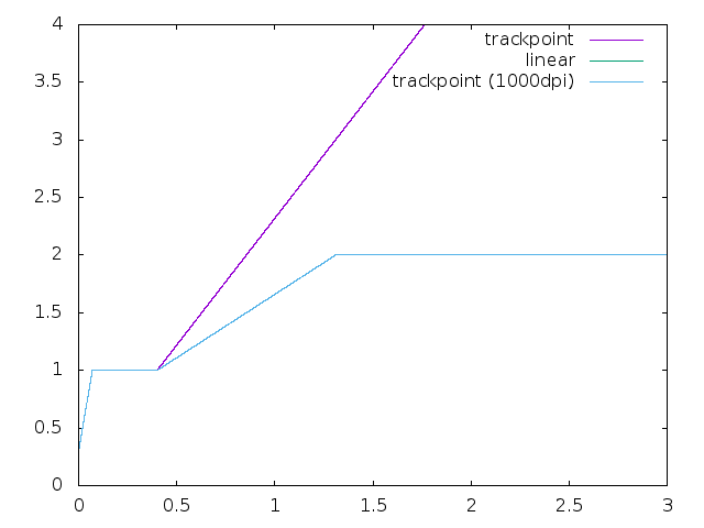Created attachment 117471 [details] rendering of the acceleration function this is your acceleration function in comparison to the linear one. For a 1000dpi trackpoint (i.e. one without a CONST_ACCEL, the function is identical to the linear one). For a low-dpi one, here a 400dpi one (const accel 2.5) the low-speed profile is the same but it accelerates faster and higher once it hits the threshold. Interesting approach, I notice however that the pointer is still very hard to control, especially once I put any serious pressure down (e.g. when I want to cross the screen), the pointer immediately shoots off way too fast. I think my main problem is the threshold, I wonder if a more linear approach would work better.