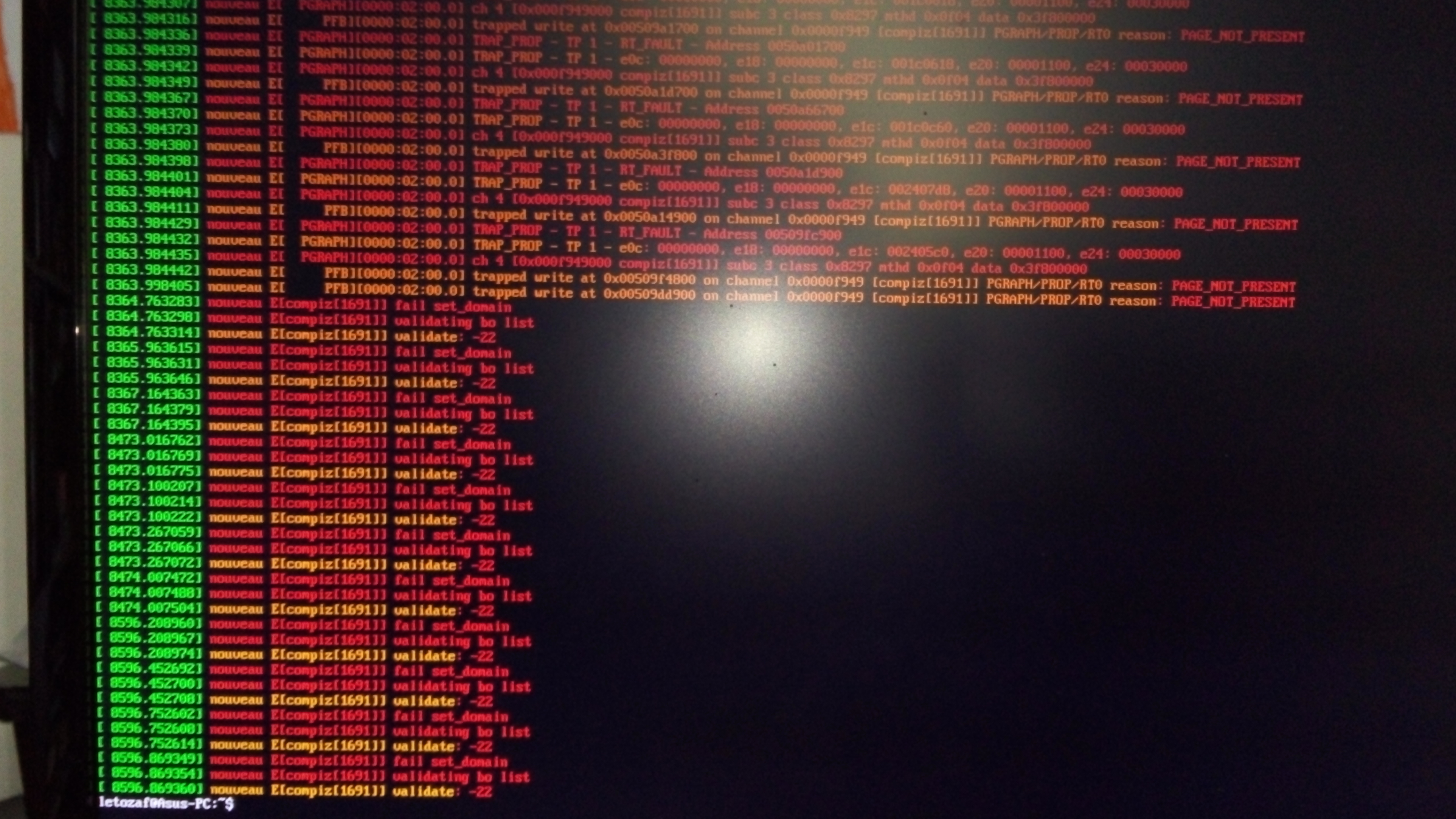 Created attachment 119171 [details] dmesg screenshot Screenshot of dmesg output while desktop was freezed by compiz process at 100% (more or less).