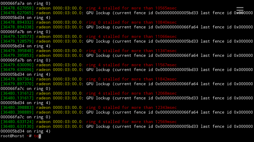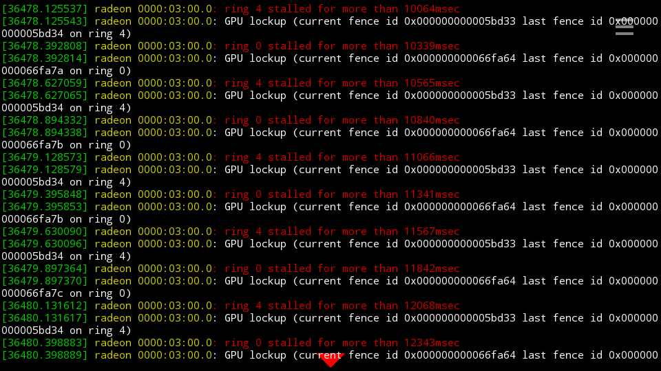 Created attachment 119002 [details] dmesg part 1 (png file) Reproduced with Left 4 Dead 2, Distance and Metro 2033 Redux. First the screen either freezes (Distance) or shows garbage, looks like many small brown rectangles on the screen (Left 4 Dead 2, Metro 2033 Redux), then, after around 30 seconds, the whole system freezes (keyboard/mouse doesn't react, ssh connections drop, finally watchdog kicks in and reboots the system). In between the 30 seconds I was able to grab some data via ssh. Screenshots attached. This is on a HD 6950.
