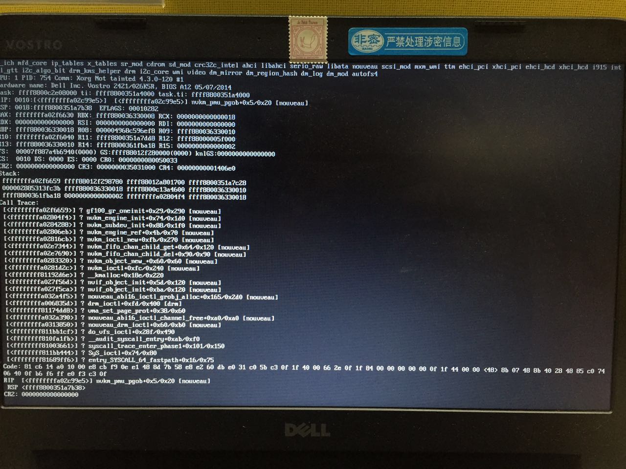 Created attachment 119500 [details] error message. Dell notebook vostro 2421, lspci output: Intel Corporation 3rd Gen Core processor Graphics Controller NVIDIA Corporation GF117M [GeForce 610M/710M/810M/820M / GT 620M/625M/630M/720M] When use kernel 4.2.x, all is ok. If use kernel 4.3.x, kernel panic. Please see attachment for more message.