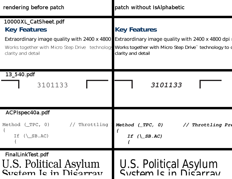 Created attachment 121099 [details] example rendering (In reply to Albert Astals Cid from comment #6) > I'm a bit hesitant on the ifdef for ICU, makes it for hard testing for the > two codepaths. How much does it actually improve things? You would prefer ICU be a mandatory dependency? Or hesitant on having ICU be a dependency at all? Completely removing the block of ICU/FcCharSet code, the majority of the text in this PDF (and a couple others I found) is probably going to be missing because there's a good chance that fontconfig is going to choose a font without Cyrillic glyphs. If I keep the FcCharSet code but remove the ICU IsAlphabetic check, some documents will have regressions as fontconfig chooses different fonts. Most of the differences are benign, replacing a font with another similar font, but some are not. Examples in the attached image. * http://www.epson.com/cmc_upload/0/000/044/561/10000XL_CatSheet.pdf * http://upload.wikimedia.org/wikipedia/de/7/77/Wikipedia_2005_Inlaycard_small.pdf Light font is replaced with a regular font because the light variant is missing some symbols like bullet, trademark, notequal, and others that are in the default encodings. * https://www.ftb.ca.gov/forms/2013/13_540.pdf - numbers along the bottom of the page * http://bugs.ghostscript.com/attachment.cgi?id=7435 - ACPIspec40a.pdf - code samples such as top of page 32 6 And a few other documents. First choice font is missing a euro symbol so fontconfig picks a bold oblique font. I'm starting to suspect this is a fontconfig bug because there are non-bold non-oblique fonts available further down the substitution list. * http://acroeng.adobe.com/Test_Files/weblinks/Links_Bookmarks/FinalLinkTest.pdf On page 3, a Bookman font is replaced with a sans-serif font because it's missing some math symbols. If those aren't a problem I can do a simpler check, skip ICU/IsAlphabetic and only filter out Unicode private use area characters. Or if it is a problem but you don't want to add ICU for something relatively simple like this, make my own blacklist of certain characters. That might be better anyway because I think the ligatures (ff ffi ffl) are also causing some minor oddities and those are still alphabetic letters.