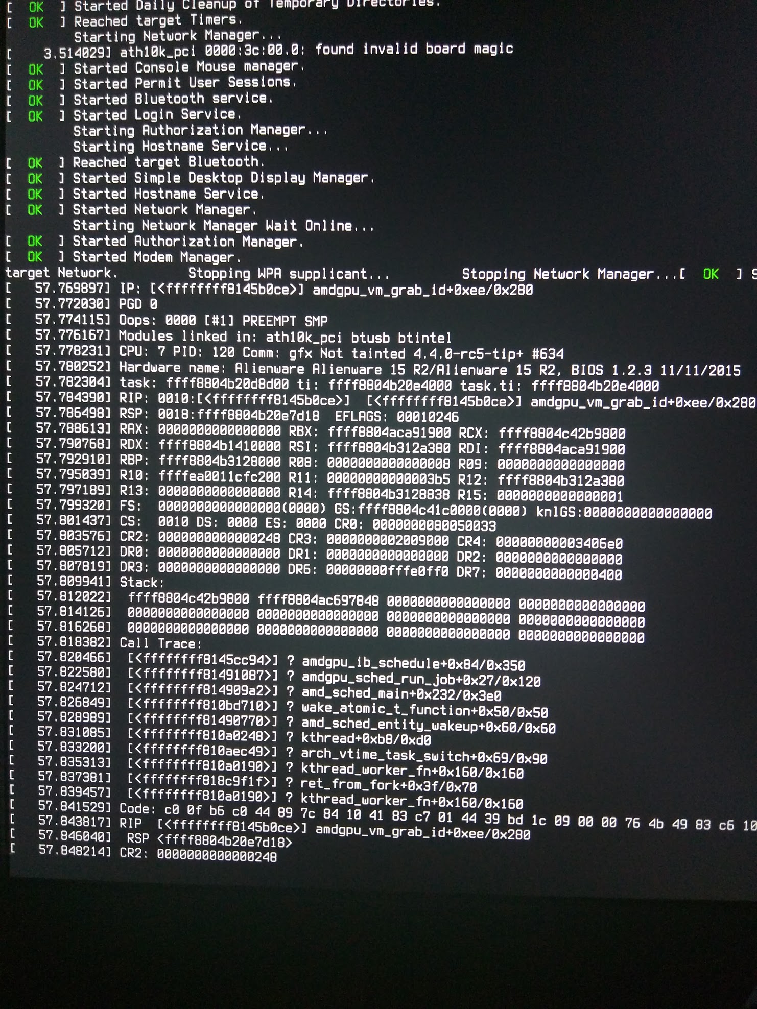 0x24e7e is in amdgpu_vm_grab_id (include/linux/fence.h:292). 287 * Returns true if f1 is chronologically later than f2. Both fences must be 288 * from the same context, since a seqno is not re-used across contexts. 289 */ 290 static inline bool fence_is_later(struct fence *f1, struct fence *f2) 291 { 292 if (WARN_ON(f1->context != f2->context)) 293 return false; This should be normal warnings, isn't bug.