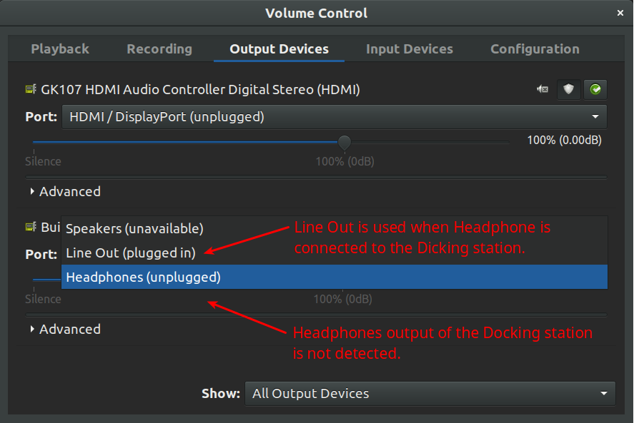 Created attachment 122456 [details] Output Devices tab in pavucontrol When I plug in a headphone into my notebook, the previously set volume level is restored which is a very nice feature. But when I connect my notebook to a docking station (a.k.a. port replicator), volume is not changed anymore. The strange thing is that microphone is reported as a separated device, but headphone is not. Maybe I need to create an udev rule for headphones? Can I get some help please?