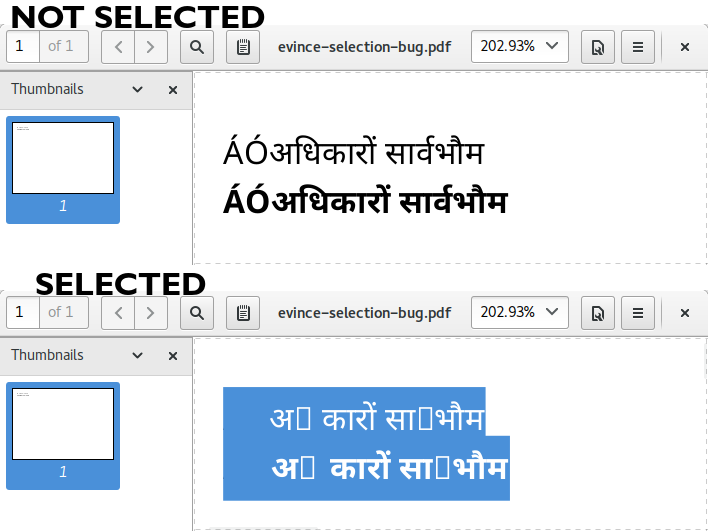 Created attachment 122875 [details] evince-selection-bug.pdf Forwarding from https://bugs.debian.org/cgi-bin/bugreport.cgi?bug=817239 ---------- Sascha Brawer wrote: Package: evince Version: 3.14.1-2 Severity: normal When selecting the text of the attched PDF in evince 3.14.1, some characters appear garbled. The _unselected_ rendering is fine, the garbling only happens upon text selection. ---------- I can confirm this on current cairo and evince master. In the attached PDF, selecting certain characters makes them disappear or turn into squares.