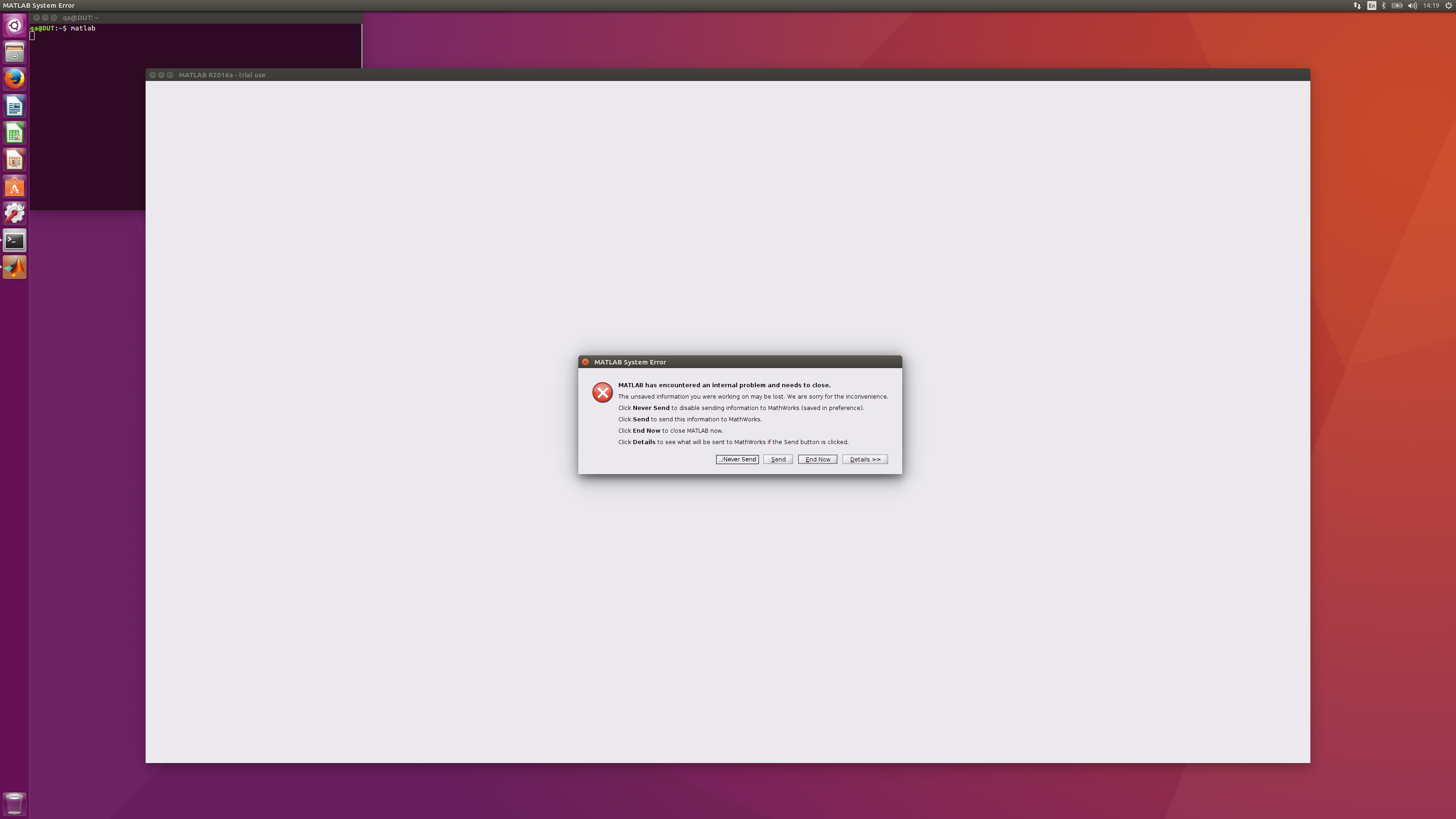 I was able to reproduce the issue. You are able to run Matlab in low graphics mode. After applying changes from Installer tool. I got the following error executing any script that involves graphics in Matlab: > run graphicsInteractiveApp.m Error using hgopengl Java exception occurred: java.lang.RuntimeException: Waited 5000ms for: <67f6359a, 553946c8>[count 2 [ add. 0, orig 2], qsz 0, owner <Startup Class Loader>, add.owner Startup Class Loader-SharedResourceRunner] - <main> at jogamp.common.util.locks.RecursiveLockImpl01Unfairish.lock(RecursiveLockImpl01Unfairish.java:198) at com.jogamp.opengl.GLProfile.initSingleton(GLProfile.java:199) at com.jogamp.opengl.GLProfile.getDefaultDevice(GLProfile.java:2003) at com.jogamp.opengl.GLCapabilities.<init>(GLCapabilities.java:84) at com.mathworks.hg.uij.OpenGLUtils$MyGLListener.getGLInformation(OpenGLUtils.java:320) at com.mathworks.hg.uij.OpenGLUtils$MyGLListener.getGLData(OpenGLUtils.java:498) at com.mathworks.hg.uij.OpenGLUtils.getGLData(OpenGLUtils.java:78) Error in hgopengl Error in graphicsInteractiveApp (line 37) d = opengl('data'); Error in run (line 96) evalin('caller', [script ';']);. Attaching Dmesg
