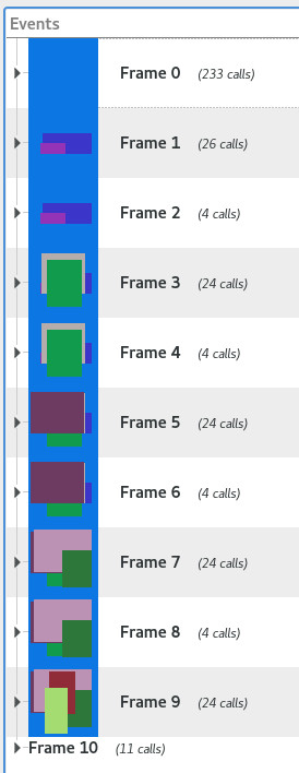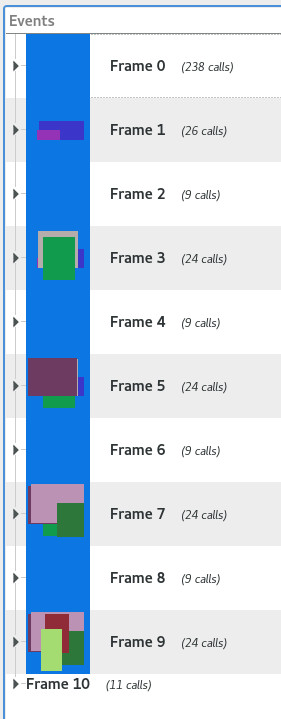I've noticed at least one thing that is causing issues with tests that use the type 'none' as one method. In those tests there are frames when nothing happens between 2 swapbuffer commmands, in these cases it looks like the backbuffer contents do not change (swap does not happen?). I will attach 2 images from apitrace where first one is regular one of the test and in 2nd one I'm making a empty clear (with scissor 0,0,0,0) in case nothing happens in that frame.