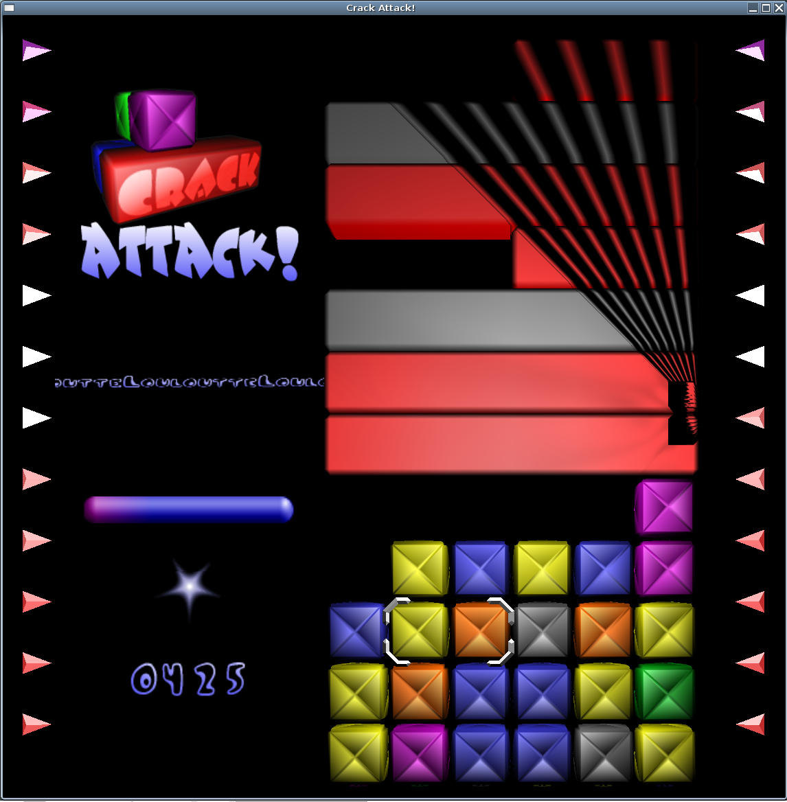 Hi, I have rendering problems when running crack-attack on a i865 chipset. I can reproduce with both mesa 6.5.1 and 6.5.2 (from Debian testing and experimental). The machine is a Dell Dimension 3000 with the following board: 00:02.0 VGA compatible controller: Intel Corporation 82865G Integrated Graphics Controller (rev 02) It's easy to reproduce since it basically occurs as soon as the game gives you multiple horizontal bars from the top of the screen. I will attach a screenshot below. I can't reproduce on a i945 chipset or on a Radeon X300, both running Debian testing too. Cheers, Brice