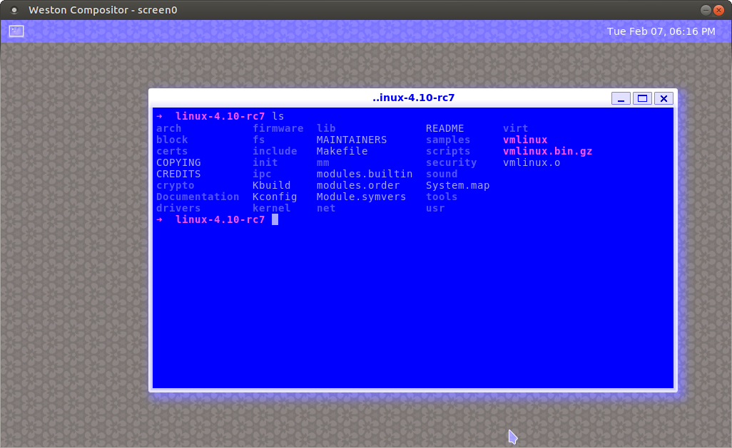 All-blue weston looks to me like alpha and blue channels are swapped. Can't say about red/green since the colors are gray. I couldn't say what the other pictures are supposed to look like. Weston has known issues on big-endian, IIRC the conversion between wl_shm and OpenGL formats is broken on big-endian. I have a vague recollection that there might not exist a matching GLESv2 format on big-endian, which means it would have to be compensated in frag shaders, which I don't think we do. While Mesa's platform_wayland.c certainly looks suspicious, there could be similar problems in the Wayland compositors too. Also the problem may be different between software-GL in clients (uses wl_shm) and hardware-GL in clients (uses EGL-specific protocol, the Wayland compositor has no room to screw that up as everything is inside the EGL implementation). Yet one more place to possibly screw things up is GBM/KMS used by the Wayland compositor, where the composite drawn with GL is exported via GBM as a buffer handle to used in KMS. That involves choosing pixel formats when creating the GBM/EGLsurface, and relaying the pixel format to KMS. OTOH if Weston is using Pixman renderer with the DRM backend, there cannot be confusion with GL formats in Weston. But, it is again a rarely (if ever) tested code path on big-endian like everything. Using Pixman renderer would force applications to use software-GL. There are so many different combinations that one really needs to choose just one to concentrate on at a time. If you want to work with Weston, maybe start with DRM backend and Pixman renderer, using programs that do *not* use OpenGL, make sure that works right, and then add complexity piece by piece. I think weston-simple-shm would be a nice test, as getting the byte order wrong would cause a cross to be drawn over the image which is otherwise unhelpful for checking if colors are correct.